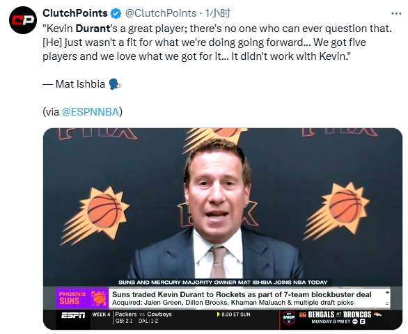 伊什比亚还表示:凯文-杜兰特是一位伟大的球员,这一点毋庸置疑,他的职业生涯非常精彩,他只是不太适合我们未来的发展方向;我们换来五名球员,我们对这笔操作很满意,很享受这样的组合,但杜兰特的加盟并没有奏效。